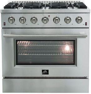 The 36-inch Galiano Dual Fuel Range combines professional style and performance in a durable stainless-steel design. With 6 sealed burners delivering a total output of 83,000 BTU, including a potent 20K dual-ring burner for boiling or searing, it excels in simmering delicate items like chocolate or sauces. The continuous cast iron grates ensure stability and easy pan sliding. The 5.26 cu. ft. electric oven outputs 6,300 Watts, perfect for baking, roasting, and broiling. Choose from true convection bake, broil, or roast. It includes 2 oven racks, an LP conversion kit, and elegant zinc-coated metal knobs with bezel rings that retain their beauty over time.Read More