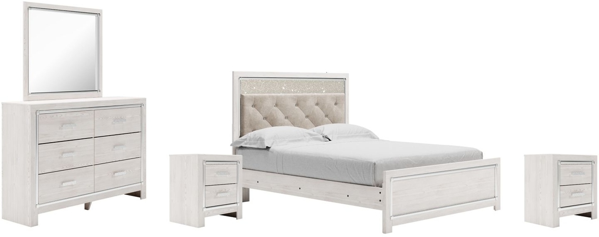 Set includes: queen upholstered panel bed (headboard, footboard and rails), mirrored dresser and 2 nightstands