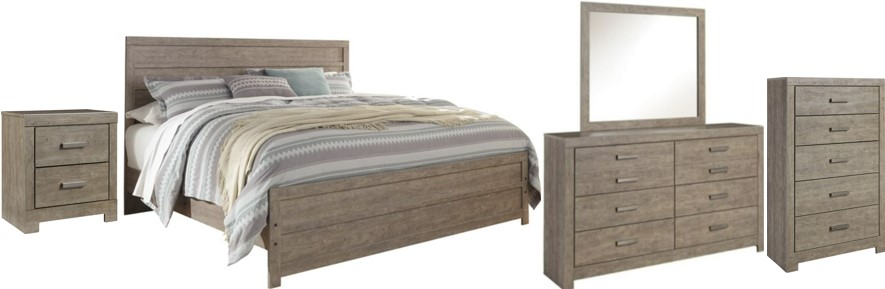Includes king panel bed (headboard, footboard and rails), 6-drawer dresser with mirror, 5-drawer chest and 2-drawer nightstand