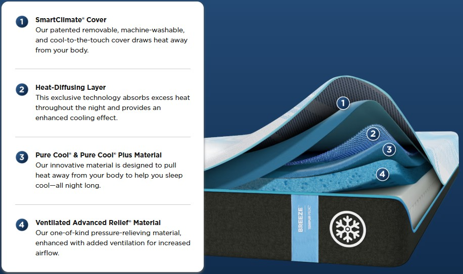 Breeze Technology - The all-new TEMPUR-LuxeBreeze® mattress feels up to 10° cooler. Featuring our newest and most advanced breeze Pure Cool® Plus material that absorbs and pulls heat away from body, it works with specialized cool-to-the-touch breeze covers so you stay measurably cooler - all night long.Read More