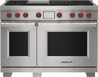 Wolf® 48" Stainless Steel Freestanding Dual Fuel Range and Infrared Charbroiler and Infrared Griddle features dual-stacked, sealed burners, Dual VertiFlow™ convection system, Gourmet Mode, 10 chef-created cooking modes, LED backlit control bezels, self-clean, delayed start, timed cook, and Sabbath features.Read More